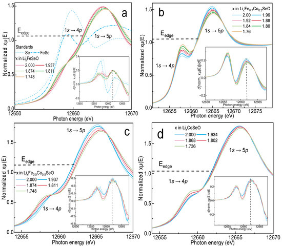 According to the Pauling electronegativity values for Li, Co, Fe, and Se of 0.98, 1.88, 1.83, and 2.55 [22,40], respectively, the Li–Se chemical bond remains on the verge of the empirical criterium for a typical ionic bond (the difference between electronegativities should be ≥1.9), whereas the Fe–Se and Co–Se bonds are more of a covalent type. Clearly, lithium removal would increase the amount of covalently bonded selenium, which would result in growing 1s → 4p feature, as it is shown for all studied Li2Fe1−xCoxSeO materials. Interestingly, this feature is more resolved for Li2Fe0.7Co0.3SeO, and it grows more significantly with lithium extraction compared to other compounds. This finding is probably associated with some electronic effects, as iron and cobalt have almost the same values of electronegativity.