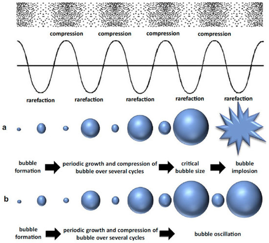 Scheme of the processes of inertial cavitation (a) and non-inertial cavitation (b) under ultrasound solicitation. Reproduced with permission from Vyas et al. [40].