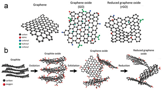 Scheme of (a) pristine graphene, GO, rGO, and (b) their production. Reprinted from Abu-Nada [52] under CC license 4.0.