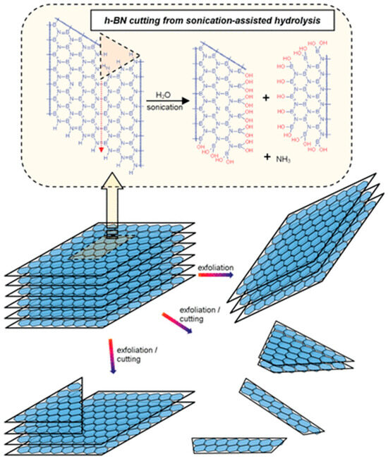 The first study using ultrasound-assisted techniques (UATs) for the production of BN flakes was reported by Han et al. [103]. The authors performed liquid-phase sonication exfoliation of BN single crystals in the presence of a 1,2-dichloroethane solution with a surfactant agent for 1 h. The resulting BN consisted of a mixture of single-layer flakes and multilayer material. This initial attempt at using UATs for the production of 2D BN was further improved by several works that replaced the organic solvent with a water solution of methanesulfonic acid [104]. Štengl et al. [105] employed a mild organic medium environment using dimethylformamide and a high power of up to 2 kW. This approach could be easily scaled up to gram-scale production without substantial modifications [106]. Marsh et al. [107] systematically investigated the effect of various mixtures of water with alcohols and found an optimal trade-off with a 60 wt.% tert-butanol solution. Lin et al. [108] took a step forward by developing UATs for the exfoliation of BN in an aqueous medium for 8 h, suggesting a mechanism as depicted in Figure 3.