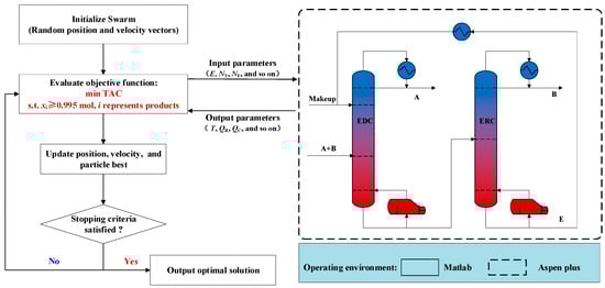 Figure 1 shows the optimization process for each entrainer. The Component Object Model technology facilitated data exchange between Matlab and Aspen Plus. The Particle Swarm Optimization (PSO) algorithm was employed to optimize the parameters of the distillation process in Matlab []. The PSO algorithm obtained different particles (representing distillation parameters). Subsequently, duty, ID, and other related parameters were obtained in the Aspen Plus software. These parameters were then returned to Matlab for calculating the TAC and comparison. This information was used to further update all particles until the specified requirements were met, ultimately producing the optimized results. For simulation errors that did not converge or resulted in errors within the Aspen Plus software, they were deemed unfeasible and were assigned a maximum TAC value of 2 × 107 USD/year to ensure they did not affect the output of the optimal result. The positions of the particles were controlled by the following formulas: