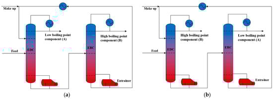 Figure 2 illustrates the sequences of extractive distillation using positive and reverse entrainers. Fresh feed and the positive entrainer enter the EDC at different trays, obtaining high-purity product A at the top of the EDC. The mixture of the entrainer and B is removed from the bottom of the EDC, and high-purity product B and the entrainer are separately withdrawn from the top and bottom of the ERC, respectively. The entrainer is cooled, and then returns to the EDC. For the ED process utilizing a reverse entrainer, there is an exchange in the positions for obtaining products A and B. Product B is removed in the EDC, while product A is withdrawn in the ERC.