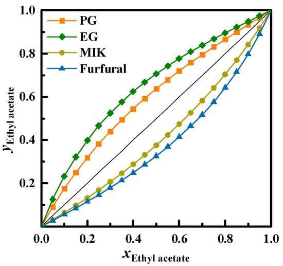 Four entrainers, namely PG, methyl isobutyl ketone (MIK), furfural, and EG, were chosen based on the previous literature [,,,]. Zhang et al. [] evaluated the deviation between vapor–liquid phase equilibrium data and the data calculated by the Wilson, NRTL, and UNIQUAC models in Aspen Plus software. Among these models, the UNIQUAC model exhibited the smallest deviation. Therefore, the UNIQUAC model was chosen to predict the vapor–liquid phase equilibrium behavior of the ethyl acetate–ethanol in this study. The binary interaction parameters of the UNIQUAC model used in this process were sourced from the Aspen Plus software, as shown in Table 4.