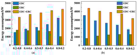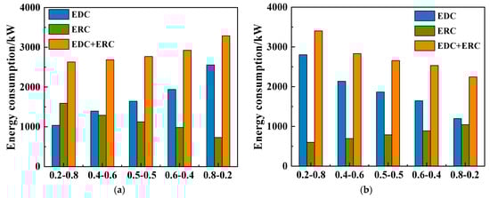 Energy consumption under different feed compositions: (a)water; (b) CB.