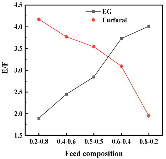 The E/F needed increased with the rise in the content of light key components in the feed composition, as shown in Figure 6. When EG was the entrainer, ethyl acetate was the key light component; when furfural was the entrainer, ethanol became the key light component. When the light key component content was at 0.2, the E/F for EG and furfural, used as entrainers, were 1.89 and 1.95, respectively. When the light key component content reached 0.8, the E/F for EG and furfural were 4.01 and 4.17. Therefore, one of the reasons for the disparity in energy consumption between the EDC and the ERC, which is due to the changing feed composition, is the varying E/F.