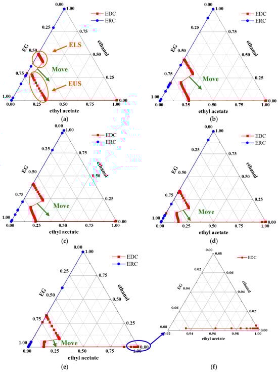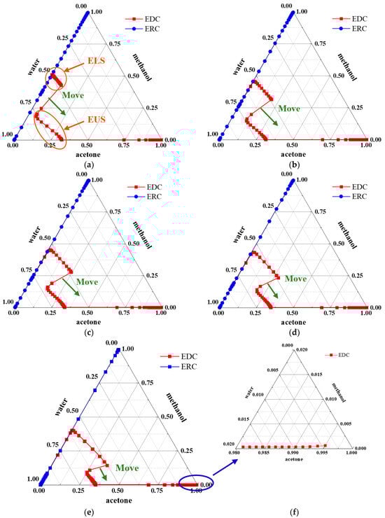 With water as the entrainer, the compositions of the EDC and the ERC were plotted as ternary diagrams, as shown in Figure 13. Similar to the results of separating ethyl acetate and ethanol systems using EG as the entrainer, as the content of the light key component acetone increased in the feed, the light key component content increased on the theoretical plates dividing the EUS and ELS. Simultaneously, the change in heavy key component content that EUS occupies increased, while the change in the range of heavy key components that ELS occupies decreased. When the reverse entrainer was CB, the same phenomenon was observed.