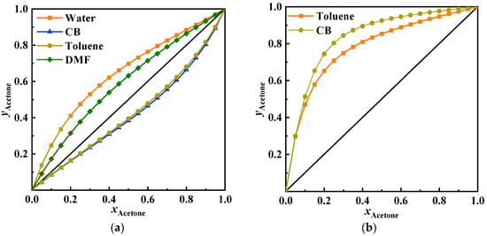 (a) x-y diagram of acetone–methanol within entrainers; (b) x-y diagram of acetone–entrainer.