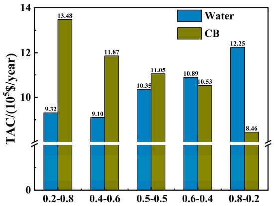 Figure 9 presents the TAC values for the optimal distillation schemes of water and CB as entrainers under different feed compositions. It is evident that, similarly to Case Study 1, first separating the low-content component in the feed as the light key component can reduce the TAC.