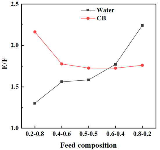 When the light key component content was 0.2, the E/F for CB and water as entrainers were 1.76 and 1.3, respectively; when the light key component content was 0.8, the E/F for CB and water as entrainers were 2.16 and 2.24, respectively, as shown in Figure 11. As the light key component content increased, the E/F also increased. Therefore, it is advisable to preferentially remove the component present in lower quantities in the feed, a conclusion similar to that drawn in Case Study 1. Similarly, the difference in the ID of the EDC and the ERC decreases with the decrease in the light key component content. When the ability of the two entrainers to alter the relative volatility of the azeotropic system varies with E/F, if the content of the light key component is higher than the heavy, the entrainer that performs better at higher E/F should be selected. Conversely, the entrainer should be prioritized for changes in relative volatility under lower E/F for lower light key component contents. Therefore, the entrainer selection for binary azeotropes should consider the light key component content in the feed.