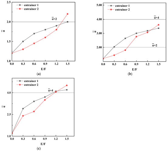 Changes in average relative volatility (ᾱ) of azeotropes with varying E/F for different entrainer types; categorized by the transition point’s ᾱ value: (a) ᾱ ≤ 2; (b) 2 < ᾱ ≤ 4; (c) 4 < ᾱ.