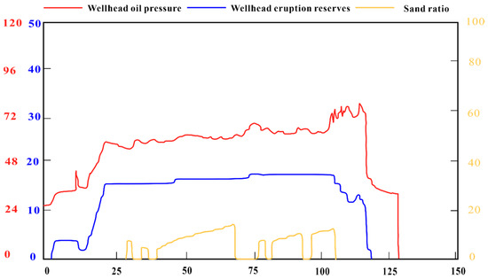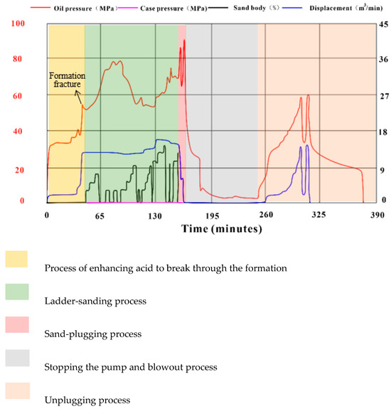 After the pressure stabilized, 70/140 mesh quartz sand was gradually introduced with sand ratios of 3%, 5%, and 7%. After injecting 9.84 m3, the pressure increased significantly, rising from 61.99 MPa to 74.47 MPa. The sand injection was stopped, and pressure stability was awaited before injecting fine sand for polishing. Subsequently, a stepwise addition of sand ratios of 3%, 5%, 7%, and 9% was carried out in conjunction with drag-reducing water, resulting in a continuous decrease in oil pressure from 79.52 MPa to 54.42 MPa. Sand injection was stopped, and coarse-grained coated quartz sand with a sand ratio of 3% was added in conjunction with drag-reducing water. After injecting 8.89 m3, sand injection was stopped to observe pressure changes. As the pressure remained stable, medium sand with sand ratios of 10%, 12%, and 14% was injected, totaling 26.44 m3. The pressure increased significantly, and after stabilization, medium sand with sand ratios of 13%, 10%, and 12% was injected in conjunction with drag-reducing water. After injecting 10.10 m3 of medium sand, the pressure rose steeply and the sand injection was stopped. Subsequent to sand plugging, there was an increase in pressure followed by a decrease in discharge volume. After injecting 46.15 m3 of drag-reducing water to replace potassium chloride, the pressure rose sharply to 95.99 MPa, causing the pump to shut down due to overpressure. During this stage, fracturing is mainly carried out using stepped sand injection for 45–155 min. At 155–160 min, the pressure becomes abnormal, and at around 160 min, the pressure suddenly rises and the pump is stopped due to overpressure.