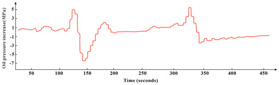 The oil pressure–time double logarithmic slope graph is drawn according to the method introduced in Section 2, as shown in Figure 5. To more clearly illustrate the trend near the sand plug, the circled sand plug section in Figure 5 is enlarged. See Figure 6 for the enlarged trend graph of the oil pressure–time double logarithmic slope. The oil pressure–time double logarithmic slope can play a very good scaling role in fracturing operations. In logarithmic functions, the smaller the X value, the larger the Y value, and vice versa. Therefore, after taking the logarithm, the slope of oil pressure–time in the fracturing construction data can be scaled. When its change is large, noise can be reduced, and when its change is small, it can be enlarged. As can be seen from Figure 6, there are two changes in the oil pressure–time double logarithmic slope within 7–8 min before and after the sand plug. Figure 7 shows the increment of oil pressure within 5 s, which can clarify the oil pressure increment and filter out small oil pressure fluctuations, highlighting the main possible sand plugs. As shown in Figure 7, when the oil pressure rises after 100 s, the oil pressure increment also rises significantly, and many small fluctuations are filtered out compared with Figure 6 within 200–250 s, especially after 350 s. Figure 8 shows the change rate of the oil pressure–time double logarithmic slope, which mainly enhances the large fluctuations of the double logarithmic slope in Figure 6, such as within 100–150 s and 300–400 s, while also enhancing the warning range. Figure 9 fits the oil pressure intercept mainly to reduce small fluctuations without affecting the main fluctuations, maximizing the main contradiction, such as the smoothing process before 100 s, the amplification process within 100–200 s, and the amplification process after 300 s in the figure.