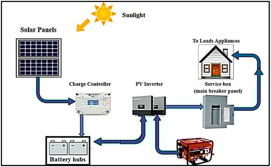 The latest and greatest non-conventional energy source is solar energy, also known as a photovoltaic (PV) system, which can continuously meet a considerable part of the world’s energy requirements in the present and future. It is also a clean, ecologically friendly energy source that is available in practically every corner of the globe. PV technology is characterized by directly converting sunlight into electrical energy. Due to the lack of moving parts (specifically for a fixed PV panel), it operates in an environmentally friendly manner and is a good source for distant applications that require little to no maintenance [11]. These are just a few of its many benefits. PV systems have proven their efficacy and dependability in numerous small- to medium-sized standalone applications and MW grid-connected power plants [12]. The primary barrier to the adoption of multi-MW solar systems is their extremely high module start-up cost [13]. Depending on their many uses, solar PV systems can be operated in multiple modes, including standalone, hybrid, and grid-connected. A freestanding system can have a storage battery or not. The solar resource at the location, the load parameters, and the system setup are the only factors that affect the system’s performance [14,15]. The incident solar radiation, which is reliant on the location, day of the week, and time of day, as well as the angle at which the sun is received and other pertinent environmental factors, is the input energy for solar PV systems [16]. The temperature at which the solar cells operate, which is influenced by the surrounding air temperature, also affects the output of the solar PV array. Hourly, daily, monthly, and annual changes are still occurring in these parameters.