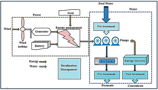 Wind energy is an environmentally friendly source of renewable energy that has been obtaining noteworthy attention in current years. Wind turbines are employed to transform the kinetic energy of wind movement into mechanical and subsequently electrical energy. Although wind turbines are classically enormous in size, it is feasible to capture wind energy in urban areas by installing microturbines on rooftops. Figure 2 depicts a diagram of a standard wind-powered desalination plant [17].