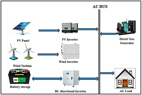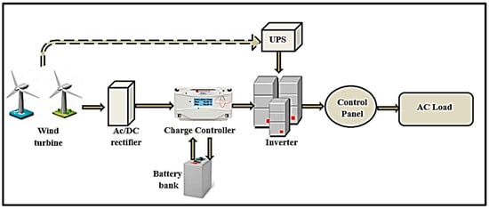 A classic wind energy standalone system (Figure 3) contains one or more wind converter, a suitable energy storage device, a rectifier, a charge controller, an uninterruptible power supply to assure a high-quality alternating current (AC), and a direct current (DC)/AC inverter. The rated power of the nominated wind turbine is subject to the system’s electricity requests, the existing wind potential, and the operative features of the device [18].