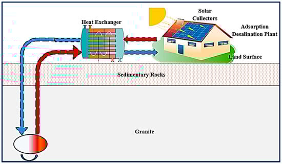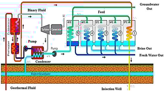 Using nearly all of the retrieved latent heat, the emergence of geothermal energy aims to generate electric energy and desalinate water as efficiently as possible [20]. To optimize overall heat conservation, the generation of electric energy and desalination must be linked. When compared to renewable energy sources that may generate electricity for a portion of a 24 h day, geothermal energy harvesting offers a significant advantage when used to power water desalination appliances. If appropriately engineered, a geothermal energy system can supply “base-load” electricity continuously and for a prolonged amount of time. The most effective utilization of this resource can be obtained by combining the production of electricity and desalination with a geothermal energy source (Figure 4).