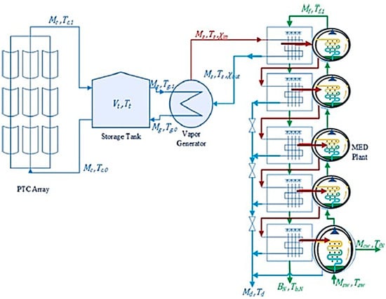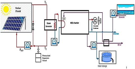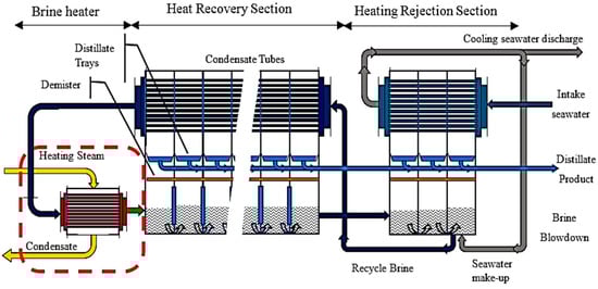 Thermal desalination technology is considered to be the most vigorous and reliable procedure in seawater desalination. In fact, it is the best option for desalting water with a salinity greater than 36,000 ppm [25]. The most distinguished thermal desalination processes are the multi-stage flash desalination process (MSF) and multiple evaporating distillation process (MED).