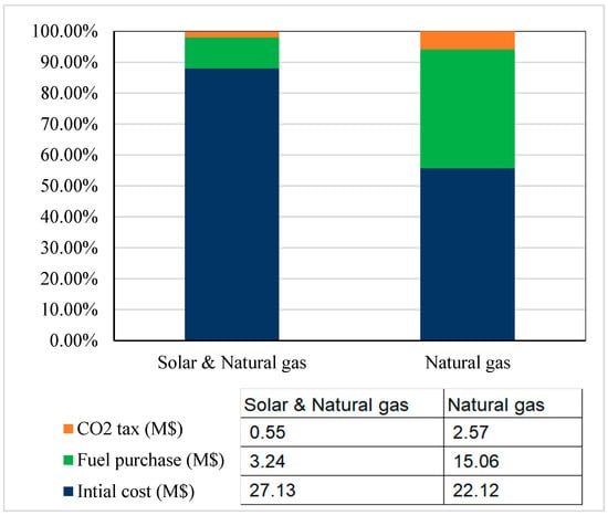 Ziyaei et al. [51] conducted theoretical study using the TRNSYS software to simulate an MSF desalination unit powered by solar parabolic trough collectors. The study was applied to seven different cities with various climate conditions and solar radiations. By applying the life cycle method, their results depicted that using solar energy with natural gas as the heat source was more economic than using natural gas only (Figure 7). Moreover, the findings indicated a variation in the cost of desalted water between USD 2.21/m3 and USD 4.32/m3, depending on the location of the cities.