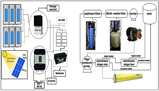 A simultaneous evaluation was carried out by Mostafaeipour et al. [75] to measure the consistency of electricity and costs in an off-grid photovoltaic unit integrated into an RO water desalination plant in nine districts of Bushehr Province in Iran. The outcomes showed that the PV units were economically and technically viable. They found that the fuzzy time functions improved the off-grid PV system’s reliability over that of basic methods. Figure 10 shows the PV-RO system, including 12 RO units, a motor, a high-pressure pump, energy storage batteries, and PV panels. Two kinds of RO units were designed, with and without an energy recovery device (ERD). The RO unit with ERD was the most effective combination.