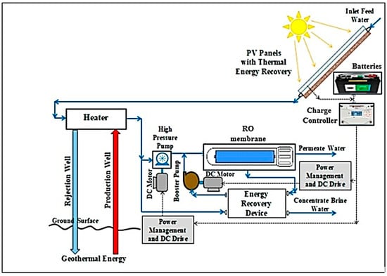 The next sections deliberate on the combined systems of RO-based water desalination and renewable energy sources of solar energy, wind energy, and geothermal energy.