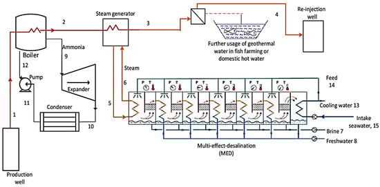 - Dashputre, A.; Kaushik, A.; Pal, A.; Jariwala, D.; Yadav, K.; Shah, M. Geothermal energy integrated multi-effect evaporator (MEE) and multi-effect distillation (MED)-based desalination systems: An ecofriendly and sustainable solutions. Environ. Sci. Pollut. Res. 2023, 30, 67941–67952. [Google Scholar] [CrossRef] [PubMed]