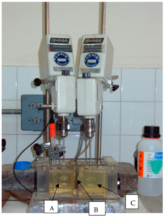 Permeation cell. A: feed phase; B: membrane support; and C: stripping phase.