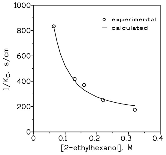 A plot of 1/KO versus 1/ might result in a straight line, with slope ∆org and intercept ∆f. From the plot, it resulted that ∆org and ∆f were 2580 s/cm and 147 s/cm, respectively, with r2 = 0.9895. The utility of Equation (12) in describing gold transport across the supported liquid membrane by 2-ethylhexanol is shown in Figure 2, where the experimental values and those calculated using this equation have been represented against the initial carrier concentration.