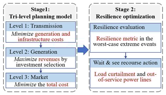 - To identify promising expansion plans, a Complementary Problem (CP) reformulation is employed to address the original tri-level programming expansion challenge, while a decomposition method is applied to manage the two-stage resilience problem.