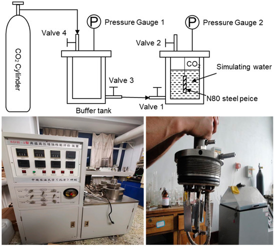 - The ionic concentration of the simulated water is shown in Table 2. We placed the dried N80 steel sheet into the reaction kettle and added 50 mL of simulated water to the kettle. We placed the treated N80 steel sheet into the experimental reactor, added 50 mL of simulated water, and screwed it down. We opened reactor valve 2, valve 3, and valve 4, opened the CO2 gas cylinder (pay attention to the buffer tank pressure), slowly opened valve 1, and passed in the CO2 gas. After the air in the reactor had been exhausted, we closed valve 2 of the reactor and continued to pass in CO2 gas from valve 1. When the pressure in the reactor reached the experimental pressure, we closed valve 2 and finished pressurizing the reactor. The pressurized reactor was placed in a thermostat for one week, two weeks, four weeks, and eight weeks. After completion of the reaction, the N80 steel sheet was removed, cleaned and dried, and weighed, and recorded as m1, m2, m3, and m4.