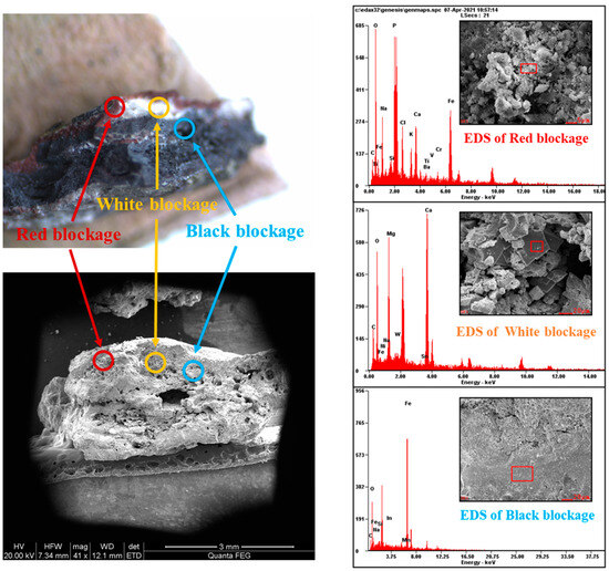 As shown in the left panel of Figure 2, the blockage can be observed to consist of a stack of white, black, and red material. Through the red square region is analyzed by energy spectrum scanning, it can be obtained that the absorption peaks of elements such as C, O, Fe, and Ca are observed in the energy spectrum of the surface red blockage, which can be determined to have iron oxides and calcium carbonate crystals. The crystals are mutually encapsulated, and it is tentatively judged that scaling and corrosion are occurring simultaneously. The electron microscope photograph of the white blockage can observe flake, strip crystals, and granular accumulation, there are absorption peaks of Ca, Mg, C, and O elements in the energy spectrum, and preliminary judgment of square scaly crystals are dolomite and calcite crystals. The bottom black blockage carbon and iron elements’ content are high after analysis and scaling is considered to be caused by electrochemical corrosion from the original pipe off the steel. In summary, the scale in the wellbore is mainly composed of calcite, dolomite, and oxides of the steel of the wellbore.
