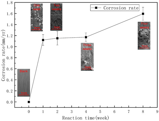 After one week of reaction, there was a large amount of scale deposited on the N80 steel sheet (Figure 3). Electron micrographs from the second week show that the metal matrix has flaked off the surface of the steel sheet. The fourth week’s electron microscopy shows that the spalled metal matrix had been filled in with scale and a crack can be found on the steel sheet, indicating that sub-scale corrosion has occurred. After eight weeks of reaction, a large area of blistering occurs on the surface of the N80 steel sheet, indicating that severe electrochemical corrosion has occurred on the surface of the N80 steel sheet. From the first week to the fourth week of the reaction, the corrosion rate of the N80 steel sheet was equal, approximately 1.23 mm/yr. When the reaction proceeded to the eighth week, the corrosion rate of the N80 steel sheet suddenly increased to 1.59 mm/yr. Combined with the SEM diagram and the solution ion concentration table, it can be seen that the surface of the N80 steel sheet showed the phenomenon of hydrogen embrittlement bulging in the eighth week, which proves that electrochemical corrosion occurred, resulting in an accelerated corrosion rate.