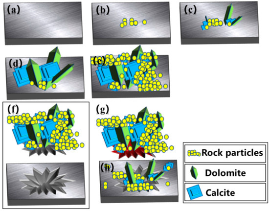 The formation process of the wellbore scale is shown in Figure 4, where the square flake crystals are calcite crystals, the granular accumulation is rock particles and the striped crystals are dolomite crystals. Figure 4a represents the original shape of the N80 steel sheet. The original nuclei in the wellbore are generated due to the temperature and pressure and changes in the wellbore on the one hand; on the other hand, during the flow of fluid through the reservoir to the wellbore, the fluid will carry the tiny nuclei in the reservoir to drift and flow, thus forming original deposits on the surface of the N80 steel sheet. Thereafter, the sediment attached to the surface of the N80 steel sheet starts to grow (Figure 4d), and other scales use this as an “anchor point” to grow and eventually become a bulk accumulation of scale. Afterward, the scale and the N80 steel sheet react with water at high temperatures in an electrochemical reaction (Figure 4f), resulting in the formation of hydrogen atoms. The hydrogen atoms diffuse into the metal and combine to form hydrogen molecules. As the hydrogen molecules are difficult to diffuse inside the metal, the concentration and pressure of H2 inside the metal rise, causing the metal to expand and deform locally, resulting in a stress concentration that exceeds the strength limit of the steel and destroys the lattice structure of the metal matrix on the original pipe, which causes the metal matrix structure to collapse and the layer of material to fall off from the well wall or pipe steel. The dislodged scale samples intermingle to form multiple layers of scale. (Figure 4g) The diagram shows that the iron atoms or ferrous ions on the surface oxidize to a reddish-brown color as the scale is transported to the surface. The (Figure 4h) diagram shows that after the scale has been removed from its original position, the scale continues to grow in the depression, and wellbore scaling and corrosion continue to occur.