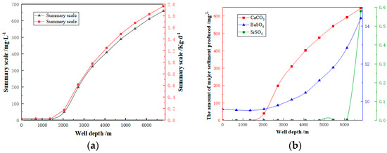 As shown in Figure 5a, the amount of scale generation increases with the depth of the wellbore. From the surface to 2000 m depth, very little was generated in the wellbore, and the amount of wellbore scale increased sharply from 2000 m to 5000 m depth, and the increase in the amount of scale in the wellbore slowed down when the depth exceeded 5000 m, to 1.97 kg/d at 6800 m. As shown in Figure 5b, the amount of calcium carbonate and barium sulfate precipitation increased with depth from 2000 m to 6800 m depth. Strontium sulfate precipitation does not occur until the depth exceeds 6120 m.