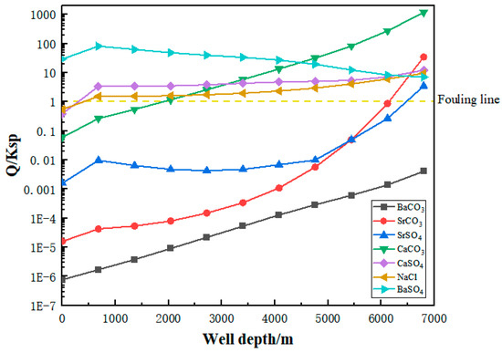 The relationship between the scaling trend of each substance and the well depth in the well Keshen block is shown in Figure 6. As can be seen from Figure 6, when the good depth is less than 6000 m, the scaling trends of strontium carbonate, strontium sulfate, and barium carbonate are less than 1, and calcium sulfate, sodium chloride, calcium carbonate, and barium sulfate precipitation are greater than 1. Therefore, strontium carbonate, strontium sulfate, and barium carbonate precipitation will not be generated in the wellbore, but calcium sulfate, sodium chloride, calcium carbonate, and barium sulfate precipitation will be generated, and among these substances calcium carbonate’s precipitation generation trend is the largest. The reason for this is that the activity product (Q) of calcium carbonate far exceeds the solubility product (Ksp) at this working condition, resulting in extensive scaling in the wellbore. The tendency for calcium carbonate and barium sulfate fouling increases with depth, so the amount of calcium carbonate and barium sulfate precipitation also increases with depth.