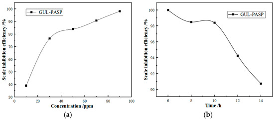 The scale inhibition efficiency of the G-PASP scale inhibitor is shown in Figure 8a; in the simulated water of Keshen block formation, the scale inhibitor showed a fast and then slow trend with the increase in solution concentration. The scale inhibition rate of G-PASP was 90.74% for 70 mg/L scale inhibitor and 98.15% for 90 mg/L scale inhibitor, respectively; as shown in Figure 8b, the scale inhibition rate of G-PASP scale inhibitor decreased continuously with the increase in heating time, and the scale inhibition rate of 90 mg/L G-PASP scale inhibitor was as high as 100.00% at 6 h of heating, and by 14 h, the scale inhibition rate of 90 mg/L G-PASP scale inhibitor reached 100.00%. L of the G-PASP scale inhibitor was 90.74% by 14 h.