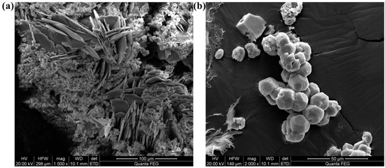 (a) SEM image of scale after heating of simulated water; (b) SEM image of scale after heating with G-PASP scale inhibitor.