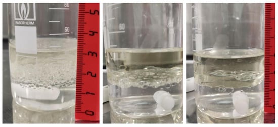 After barbotage, the FAEE samples and ethyl oleate were thermostatted at 30 to 50 °C, after which prepared water at a given temperature was added and stirred for 3–4 min at a speed of 250–500 rpm in increments of 50 rpm. This resulted in the formation of an unstable emulsion (Figure 1).