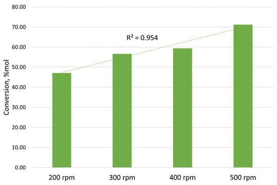 The synthesis of ethyl oleate was carried out in a perfect mixing reactor based on the HEL Auto MATE Reactor System (Supplementary Materials, Figure S2). For the synthesis, 200 mL of oleic acid, 100 mL of ethanol, 0.94 mL of catalyst (H2SO4), and 10 mL of benzene were placed in a 500 mL glass reactor. The reaction mixture was stirred for 4 h at a bath temperature of 100 °C. In the process, the triple azeotrope benzene–water–ethanol was boiled, which condensed into a Dean–Stark apparatus.