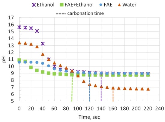 A laboratory barbotage unit was used to carbonize potassium hydroxide (Supplementary Materials, Figure S6). The unit is a glass beaker filled that was filled with the KOH solution so that the electrode of the pH meter (2) was freely immersed in it. For the accuracy of the study, the same level of liquid in the beaker was maintained in all experiments.