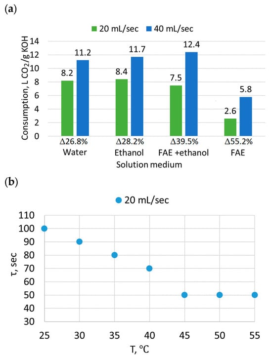 The works in the field of vegetable raw materials transesterification are united by one goal—reducing the reaction time while maintaining high conversion rates—since alkaline methanolysis and ethanolysis of triacylglycerides under conditions of alcohol molar excess takes from 1 to 6 h [,]. Among them, we can conditionally distinguish several directions [,]: