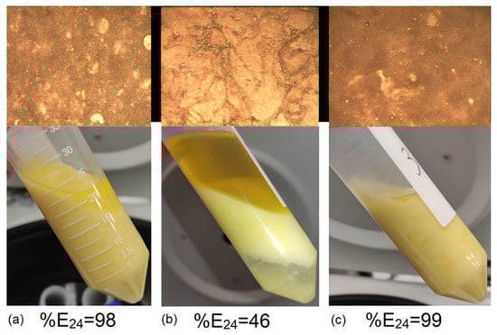 The essence of the experiment consisted of mixing organic samples with water in a volume ratio of 1:1 at different temperatures and further fixing the height of the emulsion layer and the time of separation. These experiments were designed to consider the influence of mixing speed, temperature, and the composition of the ether fraction on the stability of the obtained emulsion of the “water-in-oil” type.