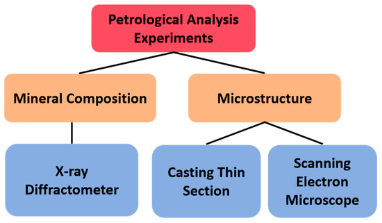 The mineral composition of the samples was quantitatively analyzed using a DX-2700 X-ray diffractometer. For the cast thin section (CTS) experiment, a colored liquid was injected into the rock pores under vacuum pressure. Subsequently, the rock was ground into thin sections, and reservoir structures were examined under a microscope. SEM observations were conducted using the Quanta 200 F field-emission scanning electron microscopy platform. The freshly crushed sample surfaces were bombarded with an electron beam to directly observe features such as interstitial materials, pore structures, and cementation. The specific experimental design process is shown in Figure 2.