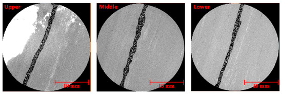 The Brazilian splitting method was utilized to split cylindrical shale cores along bedding planes, ensuring axial symmetry. This method simulates the natural formation of rock fractures by applying pressure orthogonal to the axis of the core sample, which better replicates the true fracture morphology of shale reservoirs than linear cutting [31]. Multiple measurements of the length and width of the split segments were taken, and their averages were calculated to minimize errors. This method provides a better simulation of the expansion morphology of shale fractures during hydraulic fracturing than cores obtained using glass plates, rock slabs, or wire cutting. For the preparation of fully propped fractured cores, an appropriate mass of proppant was first weighed and evenly distributed on the split segments of the shale core to prevent proppant loss. Subsequently, two 200-mesh (70 μm) sieves were placed at the inlet and outlet faces of the core to prevent any migration of proppant and/or shale fragments towards the core holder fittings and pipelines. Finally, the core was sealed and secured with heat shrink film. CT scanning was performed on the prepared proppant-filled fractured cores, as illustrated in Figure 3, demonstrating uniform proppant distribution throughout the core. This indicates that the method employed for preparing fractured cores filled with proppant meets the experimental requirements.