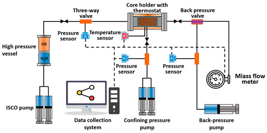 To ensure complete sealing during the testing process, all components, such as pipelines, valves, and fittings in the equipment, including the high-temperature rock core clamp that employs a special rock core sleeve, are specifically designed for ultrahigh-pressure applications with a maximum operating pressure exceeding 30% of the equipment’s design pressure. The maximum working pressure of the system can reach 180 MPa, with the highest working temperature being 150 °C.