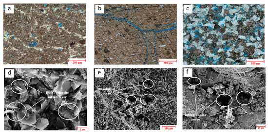 The results of cast thin sections (CTSs) and scanning electron microscopy (SEM) tests are shown in Figure 5. Observations from the CTSs and SEM reveal various pore types in Jimsar shale, including intergranular pores, intercrystalline pores, and dissolution pores, with some core samples exhibiting natural fracture development. Figure 5a,b display CTSs of clayey argillaceous shale core samples, where intergranular spaces are filled with clay minerals, and the predominant cement type is matrix-supported. Figure 5b also shows distinct features of microfracture development, which are further observed under SEM (Figure 5d), revealing irregular illite/smectite mixed-layer minerals phases. Figure 5c presents CTSs of sandy argillaceous shale core samples, mainly composed of detrital grains with point or line contacts between them, and the dominant cement type is clastic. SEM observations reveal the presence of dissolution pores (Figure 5e) and intergranular pores (Figure 5f) in the sandy argillaceous shale core samples, with rhombohedral calcite crystals observed within the pores in Figure 5f.