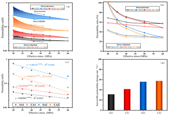 Therefore, we performed exponential fitting on the permeability curves with increasing effective stress for four core samples (Figure 6c). It can be observed that the stress sensitivity coefficient of fractured core samples is greater than that of pore-type core samples. This result is consistent with the findings of Duan et al. [39]. However, overall, the stress sensitivity coefficients of both pore-type and fracture-type cores are higher than those reported by Duan et al., which could be attributed to differences in the properties of the experimental test cores and variations in the range of effective stress testing. Additionally, there is a significant difference in the stress sensitivity coefficients between the two types of porous core samples, with the stress sensitivity coefficient for the sandy argillaceous shale core (SA1) being 0.018 and for the clayey argillaceous shale core (CA1) being 0.023. In contrast, the stress sensitivity coefficients of the two fractured core samples are nearly similar, with the stress sensitivity coefficients for the sandy argillaceous shale core (SA2) and clayey argillaceous shale (CA2) being 0.039 and 0.041, respectively.