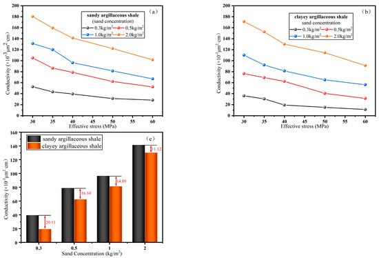 (a,b) Variation in conductivity with effective stress under different concentrations of proppants for sandy argillaceous shale and clayey argillaceous cores, respectively. (c) Conductivity comparison under an effective stress of 60 MPa for sandy argillaceous shale and clayey argillaceous cores with varying concentrations of proppants.
