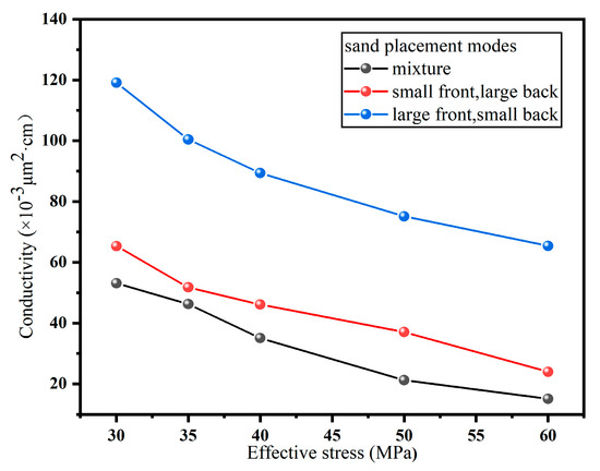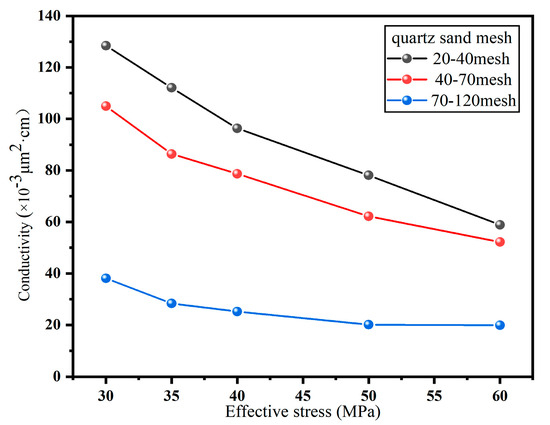 Overall, as the mesh size of the proppant increases, the conductivity of the fractures significantly decreases. Additionally, as the effective stress increases, the conductivity decreases as well. Within the experimental testing range, the conductivity of the 20–40 mesh quartz sand is the highest, ranging from 66.78 × 10−3 to 132.43 × 10−3 μm2·cm. The second highest conductivity is observed with the 40–70 mesh quartz sand, ranging from 52.24 × 10−3 to 105.02 × 10−3 μm2·cm. The 70–120 mesh quartz sand exhibits the lowest conductivity, ranging from 10.88 × 10−3 to 42.07 × 10−3 μm2·cm. The experimental results indicate that larger proppant particles result in higher conductivity. This is because the porous medium composed of larger proppant particles has higher porosity. Smaller particle proppants tend to pack more tightly, thereby reducing conductivity. It is noteworthy that when the net stress increases from 30 MPa to 60 MPa, the conductivity of the 20–40 mesh proppant experiences the greatest decrease, with a total decrease of 54.2%. Elsarawy et al. [44]. conducted tests on the fragmentation rates of quartz sand proppants of different particle sizes under the same stress. Their results indicate that smaller proppants exhibit lower fragmentation rates compared to larger proppants under equivalent stress conditions. Consequently, as the effective stress gradually increases, a fraction of the quartz sand fractures into several smaller particles, obstructing effective flow channels, reducing original pore space, and ultimately results in decreased conductivity. The observed differences in conductivity decreases among proppants of various sizes suggest that larger proppants may imply poorer hardness and greater stress sensitivity.