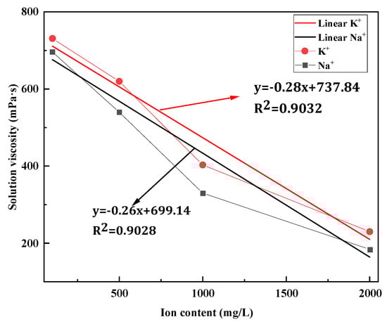 A polymer solution with a mass concentration of 2500 mg/L was prepared by diluting the polyacrylamide mother liquor with mineralized water containing only K+ and Na+. The effect of K+ and Na+ ions on the viscosity of polymer solution is presented in Figure 1. It performs linear fitting, and the fitting results are shown in Figure 2.