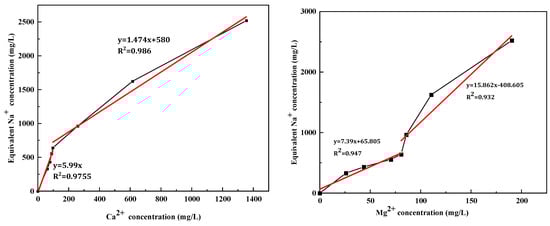 Based on the equivalent Na+ mass concentration at the same viscosity obtained in Table 1, establish the mathematical relationship between the mass concentrations of Ca2+ and Mg2+ and them. The significance of the slope in the mathematical relationship lies in the difference in the ability of Ca2+, Mg2+ and Na+ to affect viscosity when the ion concentration increases. The smaller the slope, the greater the concentration, and the smaller the impact of Ca2+ and Mg2+ on viscosity; otherwise, vice versa.